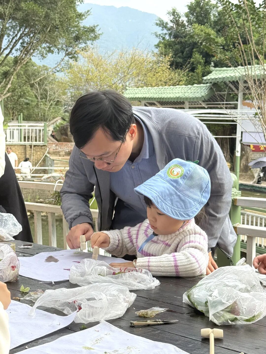 采集花草树叶通过敲击将植物的脉络和色彩拓印在方巾上制作独一无二的自然艺术品;