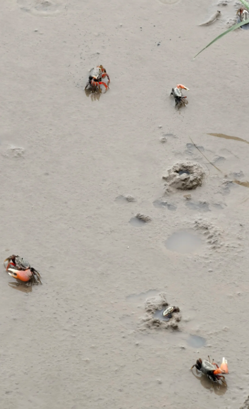 红钳蟹又名“招潮蟹”,在涨潮的时候,这种蟹喜欢站在洞穴口,高举着那只粗壮有力的大螯,好像在招手示意,欢迎潮水的到来。